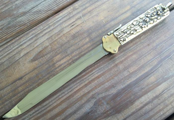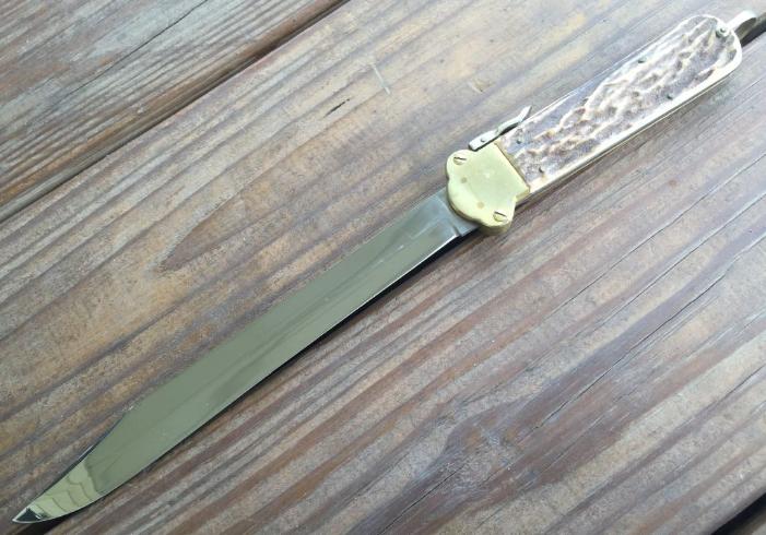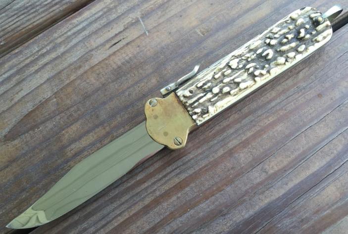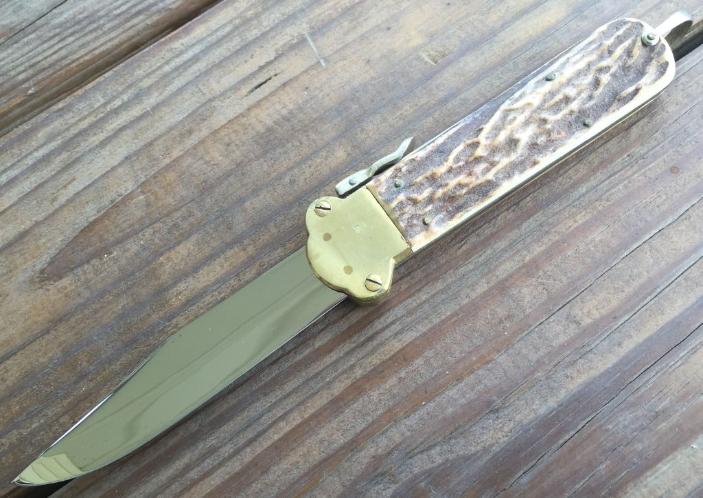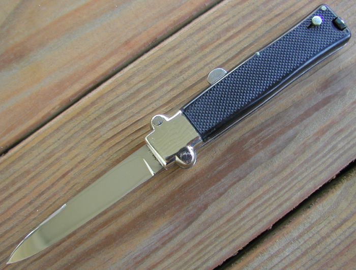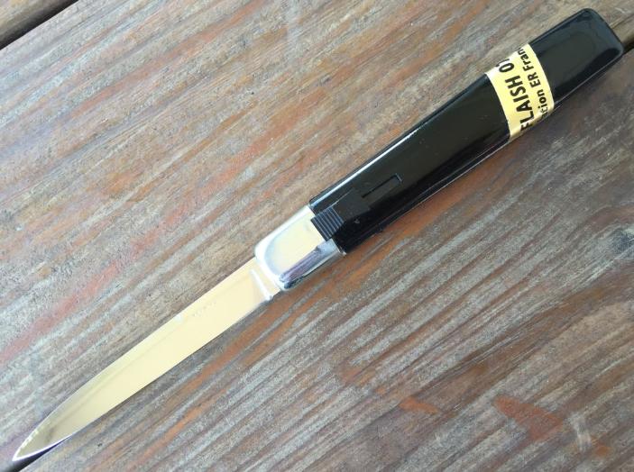 between . This knife closes by pressing the button to let the blade drop down most of the